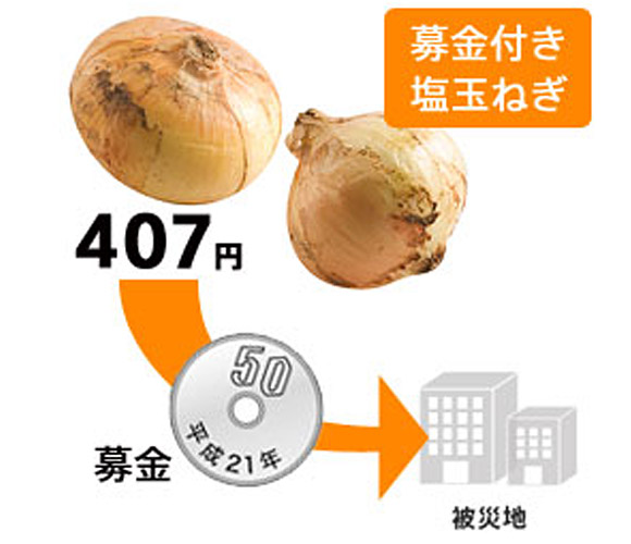 <概要> 商品毎に決まっている募金金額が、直接被災地へ送られます。現在販売している塩玉ねぎをご購入いただく際に、募金50円がついた「塩玉ねぎ」をご購入いただくと、お支払い頂いた税込407円のうち、50円を当社でお預かりして、義援金としてとりまとめて寄付をさせていただきます。