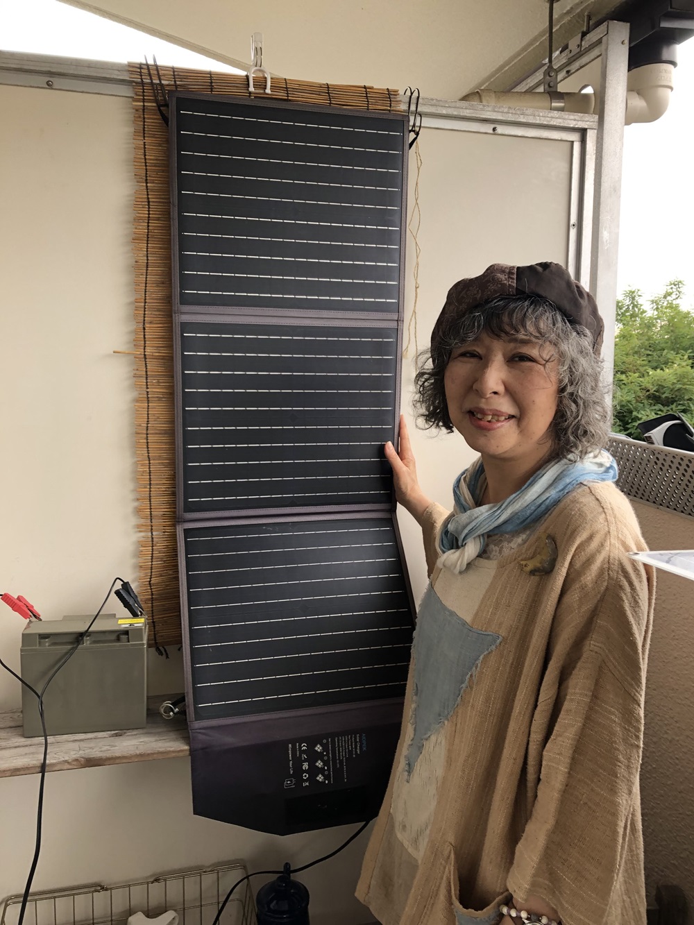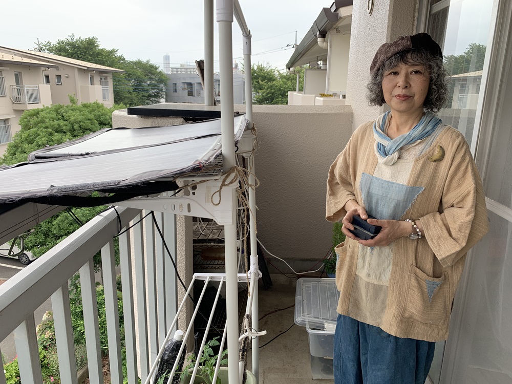 ご自宅(集合住宅にお住まい)で使用する電気は、ベランダの太陽光パネルで発電し、それを小さなバッテリーに蓄えます。容量が小さいのでおのずと節電に努めた生活になります。
