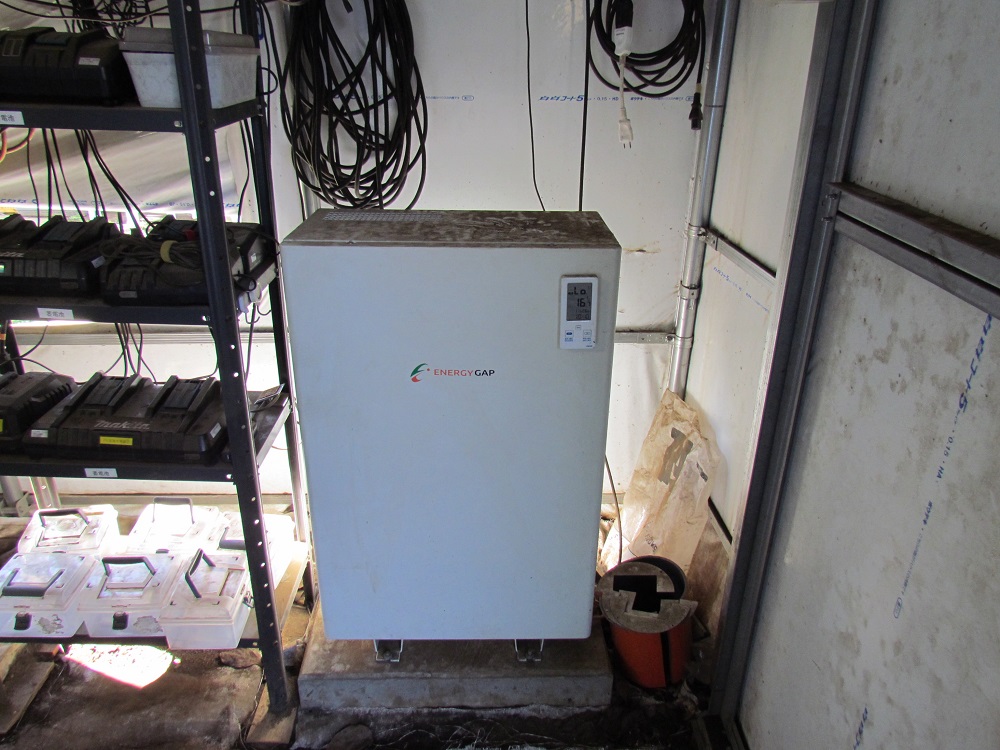 ハウスの上に設置された太陽光パネルで発電した電気を、この蓄電池に貯めていつでも使用できます。