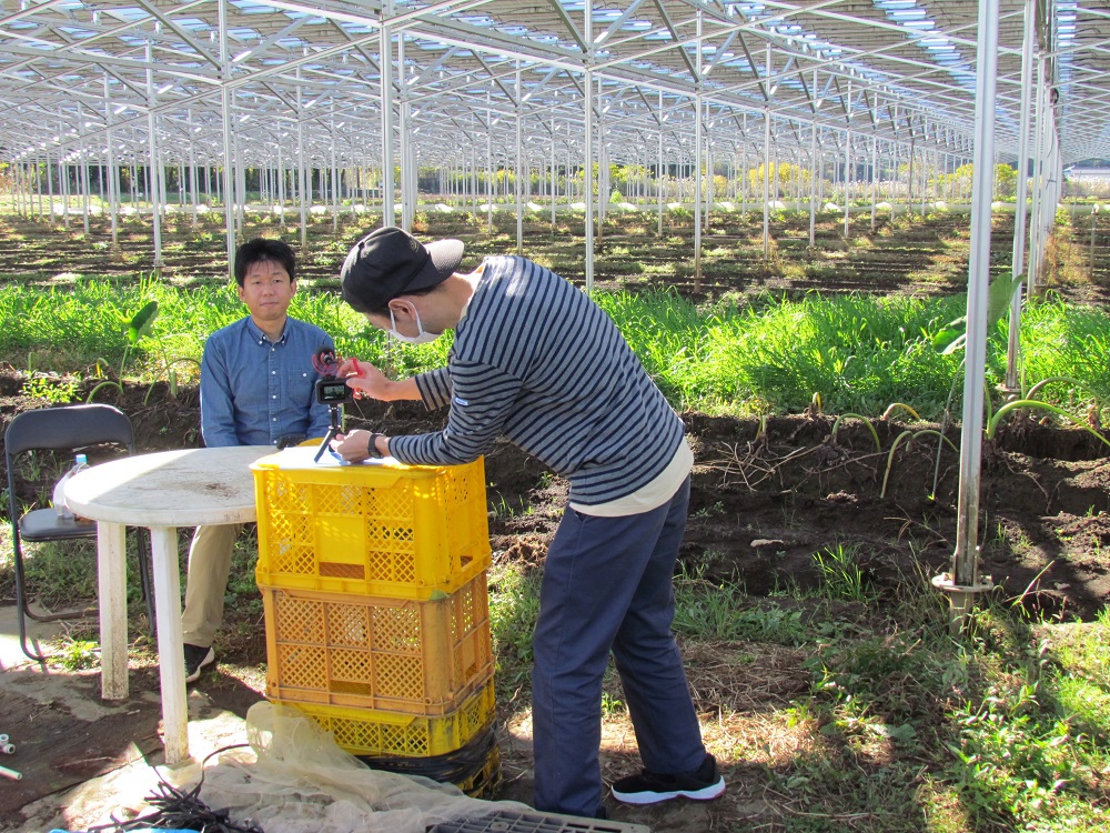 ※ソーラーシェアリング圃場で動画撮影中の画像(訪問日:2022/11/27)。
