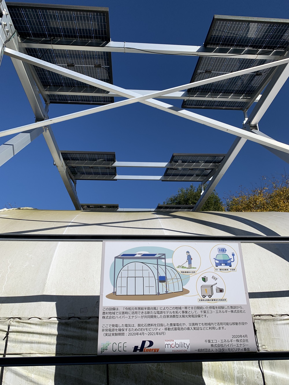 令和元年の台風により、農場ならびに周辺地域で8日間停電した経験から取り組んだ、蓄電池をセットして災害時の電源としても活用するモデル事業として設置されています。
