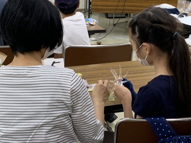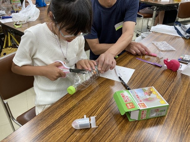 講師の先生から作り方を教わり、持参したペットボトルをハサミを使って丁寧に切り取っていき、風車の形にしていきます。