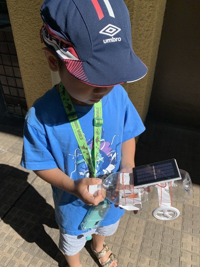 こちらもペットボトルに、KITに入っている小さな太陽光パネルを取り付け走らせます。