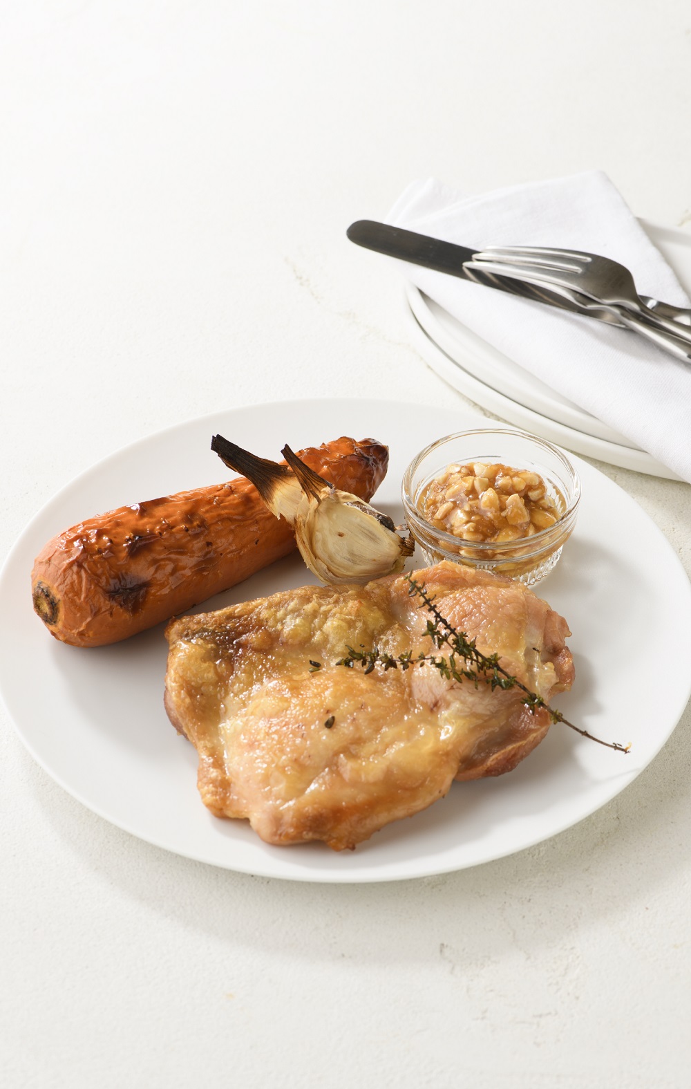 2.天板に1の新人参をのせ、約10分焼く。さらに鶏もも肉、にんにく、タイムをのせてオーブンで約20分焼く。