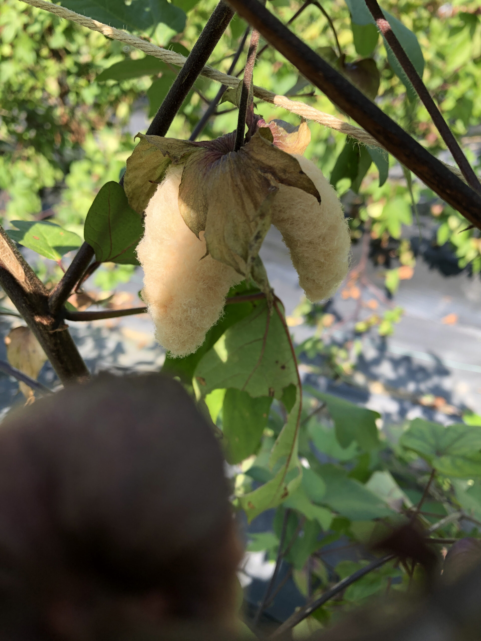 例年よりも早く訪れたため、なかなか実が割れているのを発見することができませんでしたが、かがんで下のほうを探してみるとついにオーガニックコットンの「わた」を発見することができました!
