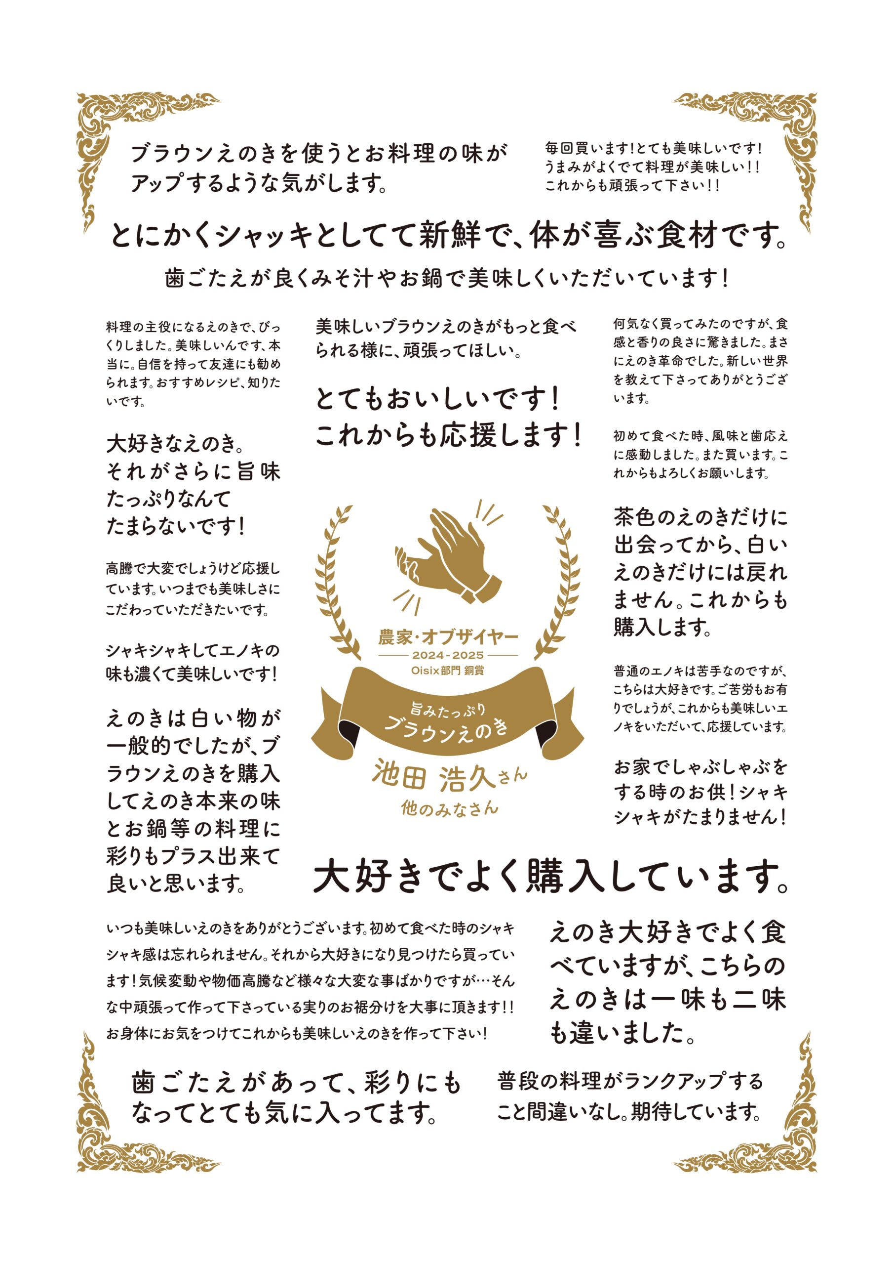 いつも美味しいえのきをありがとうございます。初めて食べた時のシャキシャキ感が忘れられず、見つけたら必ず買っています。気候変動や物価高騰など大変な中、頑張って作ってくださるえのきを大切にいただいています。お身体に気をつけて、これからも美味しいえのきを届けてください!