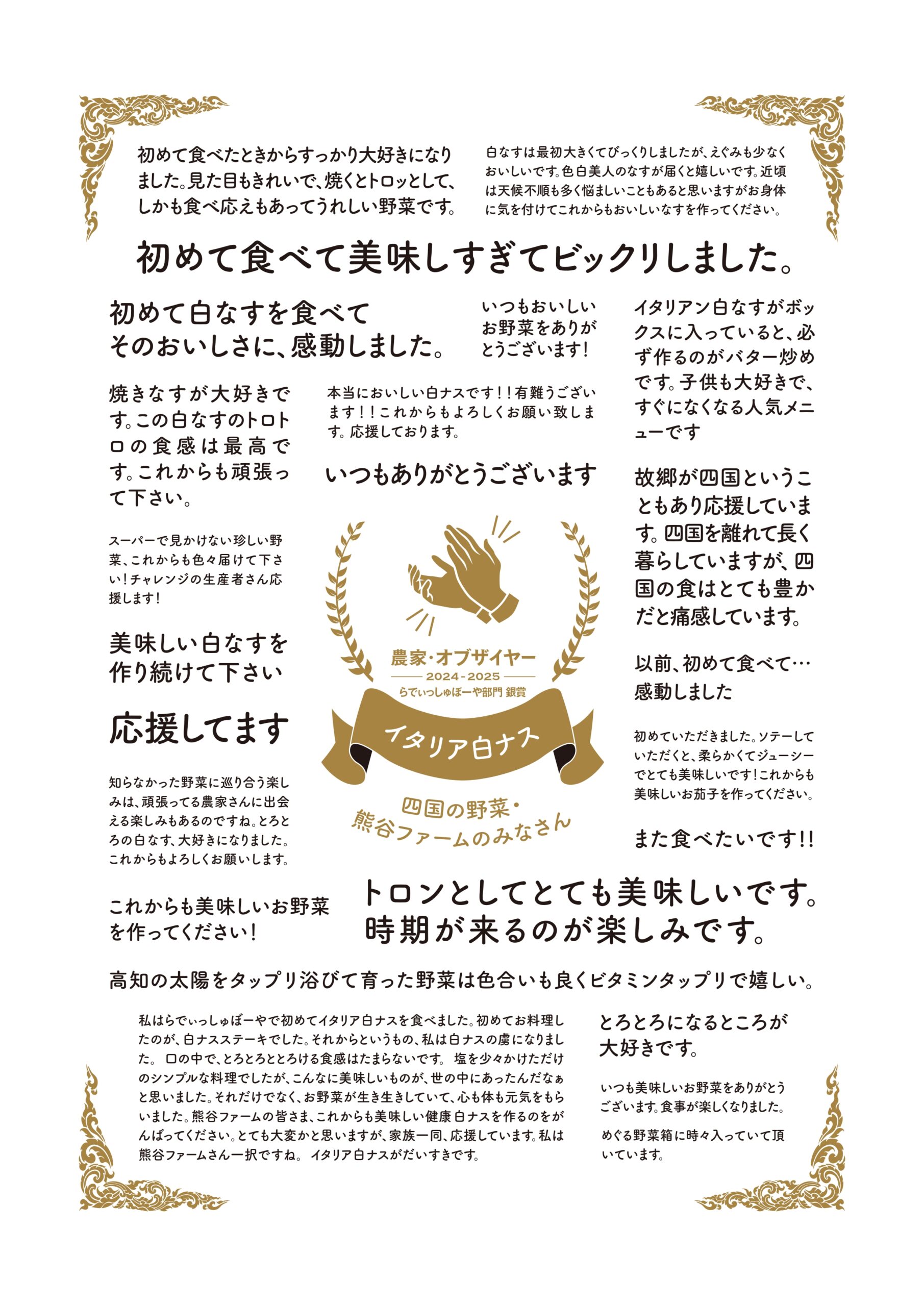 初めて白ナスを食べてから虜になりました。とろける食感に感動し、心も体も元気をもらっています。とても大変だと思いますが、家族一同応援しています。