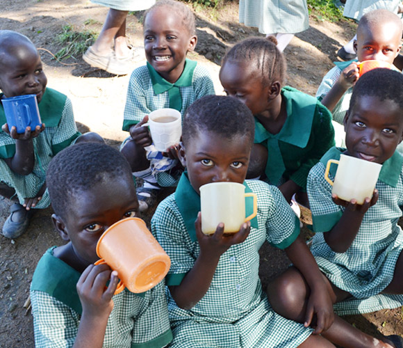 幼稚園ではこれまで、栄養状態の悪い子どもを優先して60名程度に給食が提供されていましたが、調理設備が整ったことにより138名全員の園児が食べられるようになりました。給食は朝、昼の2回。朝のメニューは「ウジ」というとうもろこしなどの穀物おかゆ。お昼は「ウガリ」というとうもろこしやキャッサバの粉を練ったもの、小魚スープ、「スクマウィキ」というケールのようなもの。 子どもたちは一人一人、給食室で温かい食事を受け取り、外に出ると思い思いの場所に陣取ってごはんを頬張ります。AIDSの蔓延率が高いこの地域では祖父母と暮らす孤児も多くいますが、ごはんを食べている時はみんな明るい顔をしています。