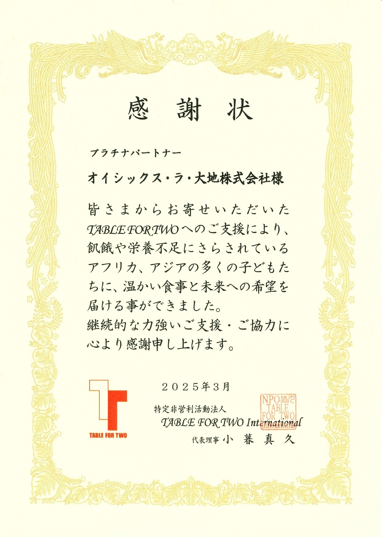TABLE FOR TWO (TFT)より、弊社の 2024 年度の支援に対して、「プラチナパートナー」として認定いただき、感謝状を受領いたしました。