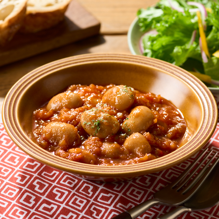 「白いんげん豆のトマト煮」は、日本発の社会貢献運動「TABLE FOR TWO(TFT)」プログラムによって、アフリカのルワンダで提供されている給食メニューをイメージしたものです。